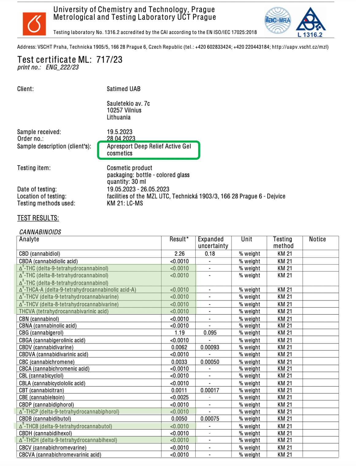 • Product ingredients and composition are proven and certified by accredited Metrological and Testing Laboratory UCT, Prague