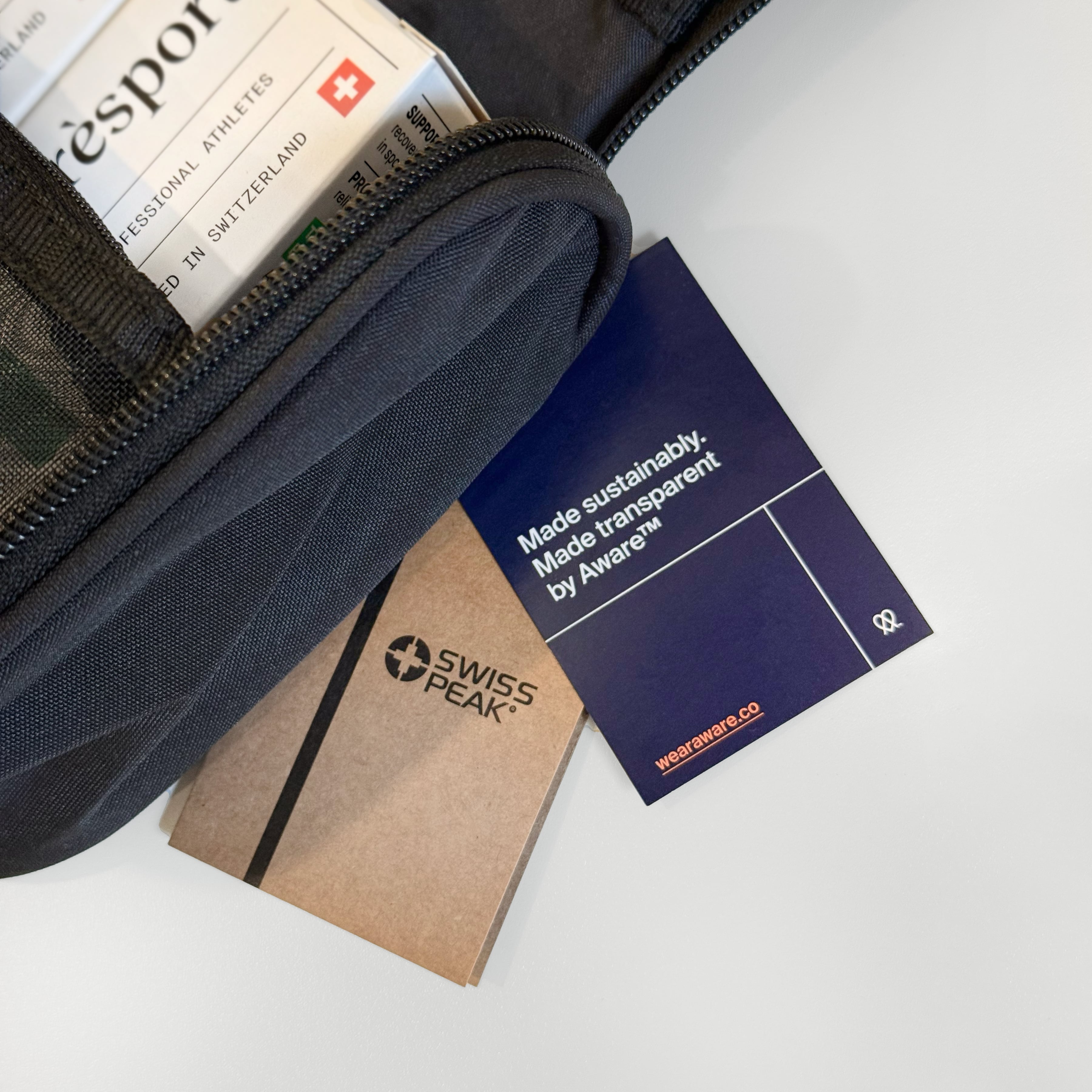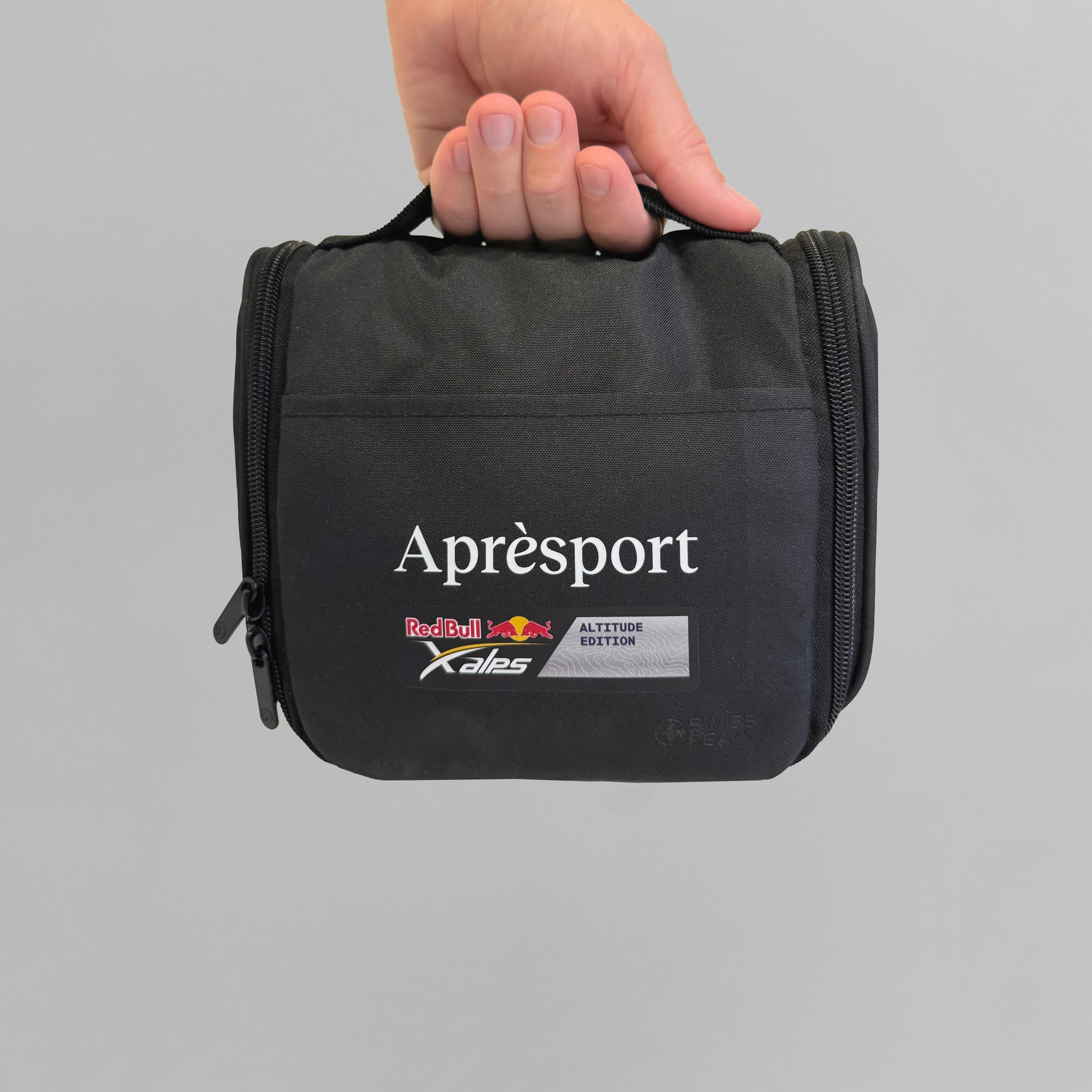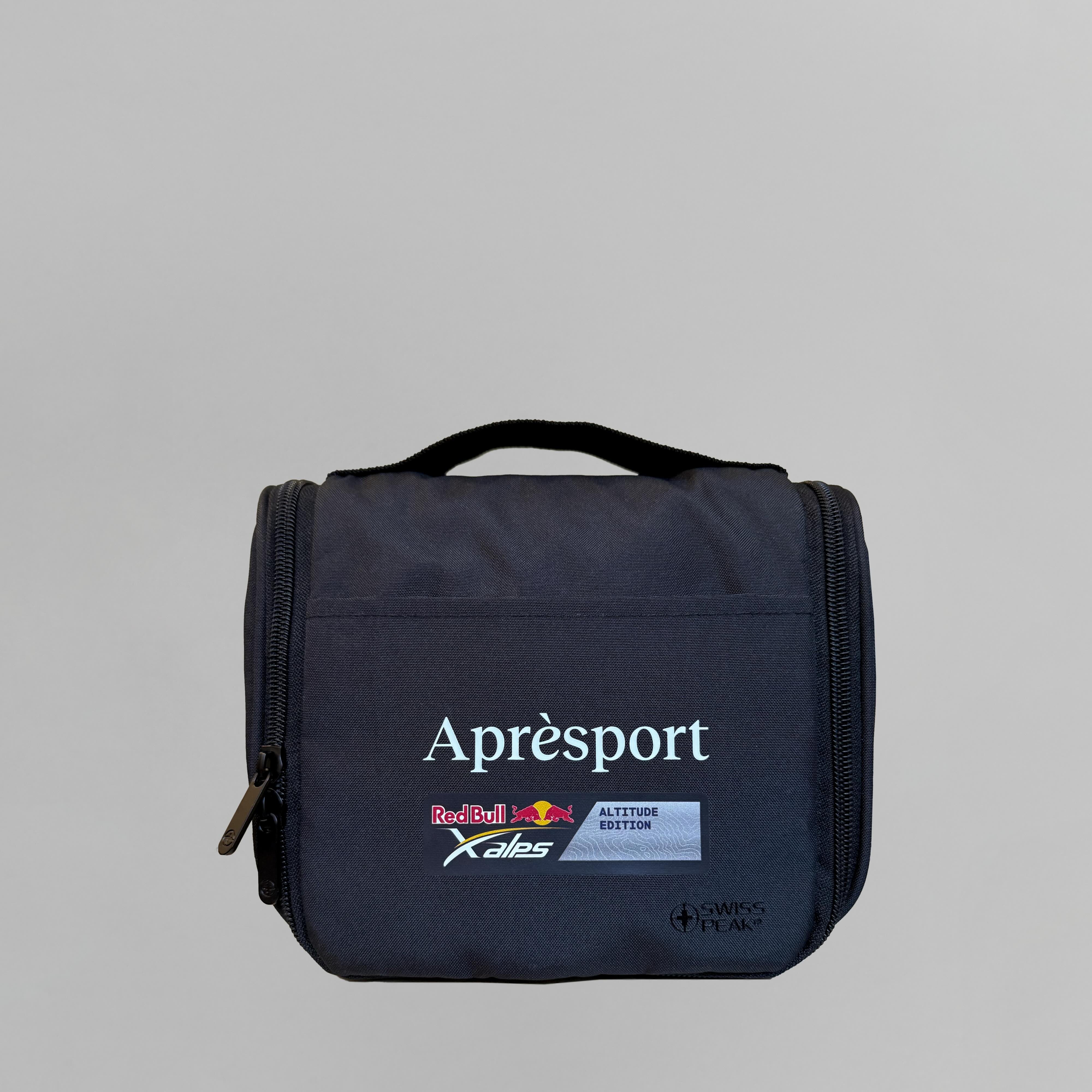 Convenient, perfect size cosmetic bag with case pockets, Aprèsport x Red Bull X-Alps Edition. This quality bag can fit most needed products plus a small towel. Features two sided zipper locks and a hook for hanging.