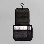 Black travel toiletry bag with hanging hook, containing travel-sized products on a gray background